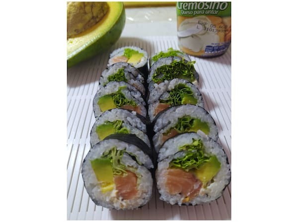 Maki con centro de salmón, lechuga, aguacate, queso crema y ajonjolí.