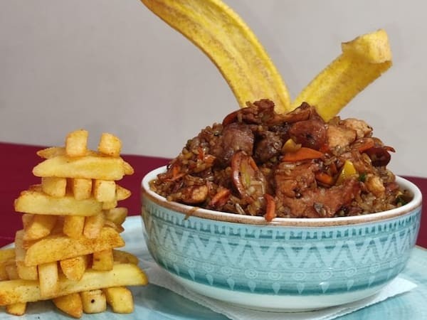 Delicioso arroz al wok con pollo, cerdo, chorizo, mix de vegetales acompañado de papa a la francesa.
