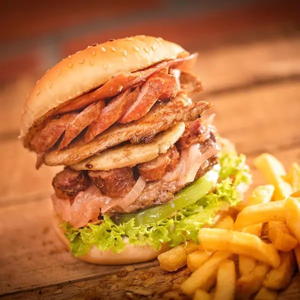 Carne de res, jamón, chorizo paisa, salchicha ranchera, pechuga, papa picada, arepa, cebolla grillé, tomate, queso crema, salsas y papa a la francesa.